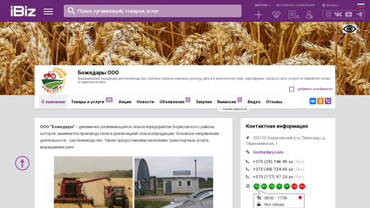 AI-анализ | This online resource represents the Belarusian company "Божедары ООО," which specializes in the production and sale of agricultural products. The main focus of the business is cultivation, including elite seeds of cereal crops, rapeseed, and perennial plants, as well as grain fodder, haylage, and hay. Additionally, the company offers services related to soil preparation and forage harvesting. The website provides information on the company's products and services, as well as contact details and a map for visitors. Keywords associated with the site include potatoes, services, 375, farming, agricultural production, and the name "Божедары." |