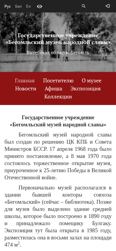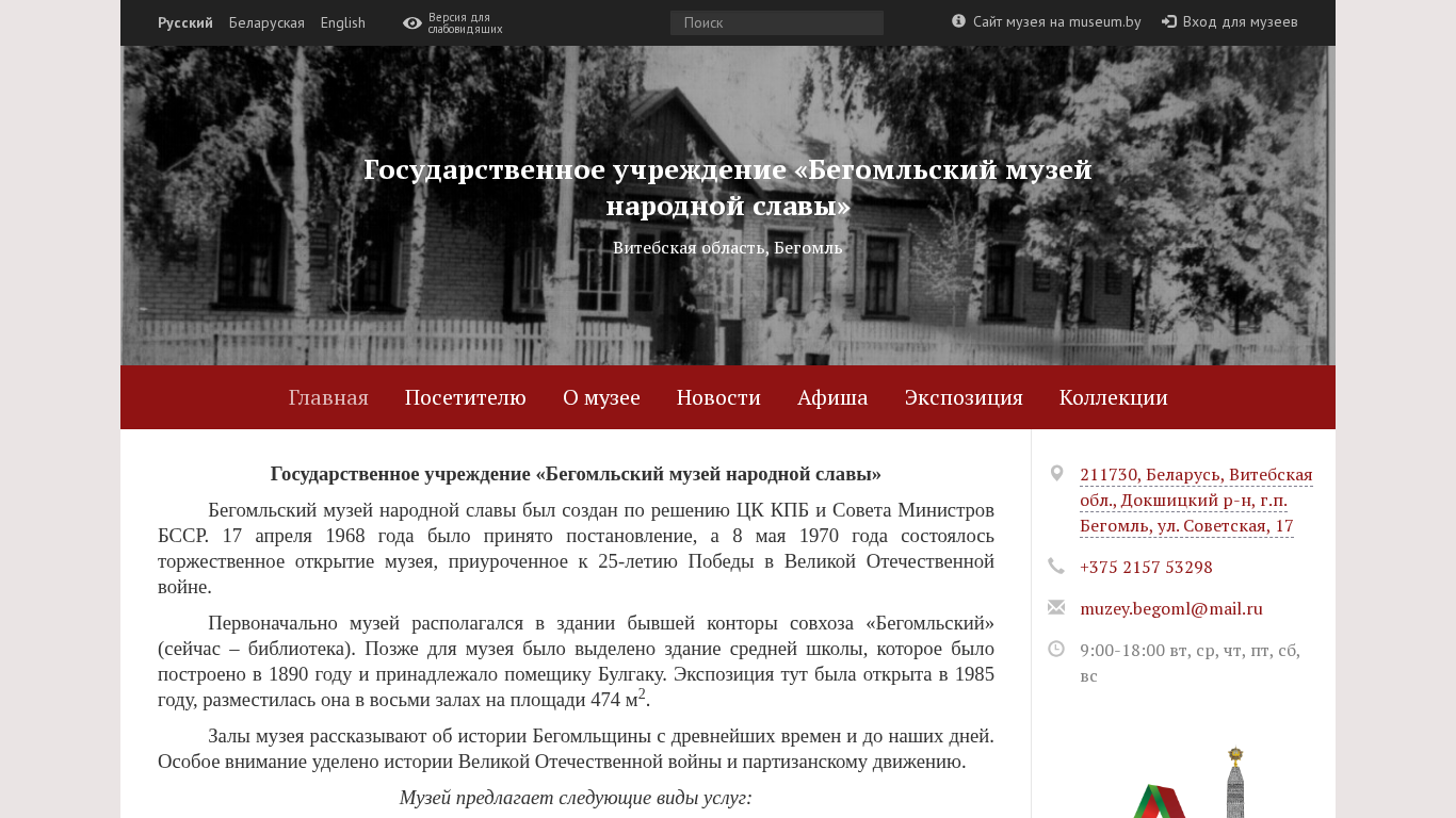 | SEO-описание | Государственное учреждение «Бегомльский музей народной славы» — новости и афиша мероприятий, информация для посетителей, цены, экспозиция, коллекции, материалы для музейщиков. |