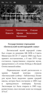 | AI-анализ | This website is for the Beloml State Museum of Folk Glory, which provides news and event information, visitor information, prices, exhibition details, collections, and materials for museum professionals. The museum was established by the Central Committee of the Belarusian Communist Party and the Council of Ministers of the Byelorussian Soviet Socialist Republic in 1968, and was officially opened on May 8, 1970, to mark the 25th anniversary of the Victory in the Great Patriotic War. Initially, the museum was housed in the former office of the Beloml agricultural collective farm (now a library), but later, a school building from 1890, which once belonged to the landlord Bulgak, was allocated for the museum. The exhibition was opened in 1985 and covers eight halls with a total area of 474 |