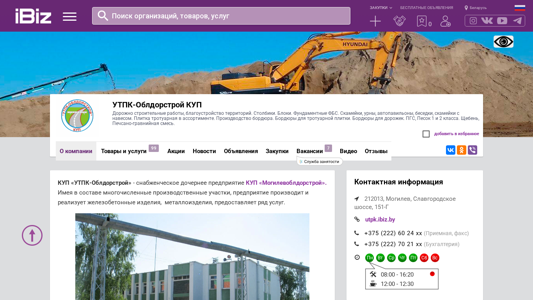 | AI-анализ | The website UTPK-Oblodostroy KUP offers a range of services related to road construction and site improvement. Products include stolbiki (posts), blocks, foundation blocks (ФБС), benches, urns, sidewalk paving stones, border production, and various classes of sand, gravel, and crushed stone. The company also provides production of reinforced concrete products and metal structures. The website includes a map for directions, contact phone numbers, and the address of UTPK-Oblodostroy KUP in Могилев, Беларусь, on Славгородское шоссе, 151-Г. |
