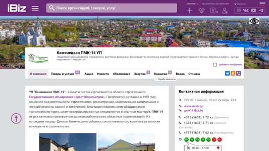 | Название / Заголовок | Каменецкая ПМК-14 УП - Общестроительные работы. Переработка, заготовка древесины. Производство столярных изделий. Производство товарного бетона. Земляные работы. Аренда недвижимого имущества.. 225051, Каменец, , 70-лет Октября, 43-1 |