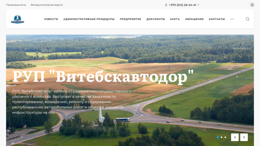 | AI-анализ | The website is a corporate site for Vitavtodor, a road management organization in Belarus. It provides information on the company's operations, services, and administrative procedures. The keywords include 'corporate site', 'order', 'buy'. The top words are 'branch', 'road-transportation management', 'management', 'works', '375', '212', 'Belarus', 'Vitebsk', 'enterprises', 'inquiries', 'administrative', 'procedures', 'regime', 'works', 'services', 'management', 'information'. The site includes sections for news, administrative procedures, and contact information for various departments and branches in different cities. The address and operating hours are provided for the main office in Vitebsk. The site also includes information on the ministry of transport and communications, the operational schedule for temporarily absent workers, a list |
