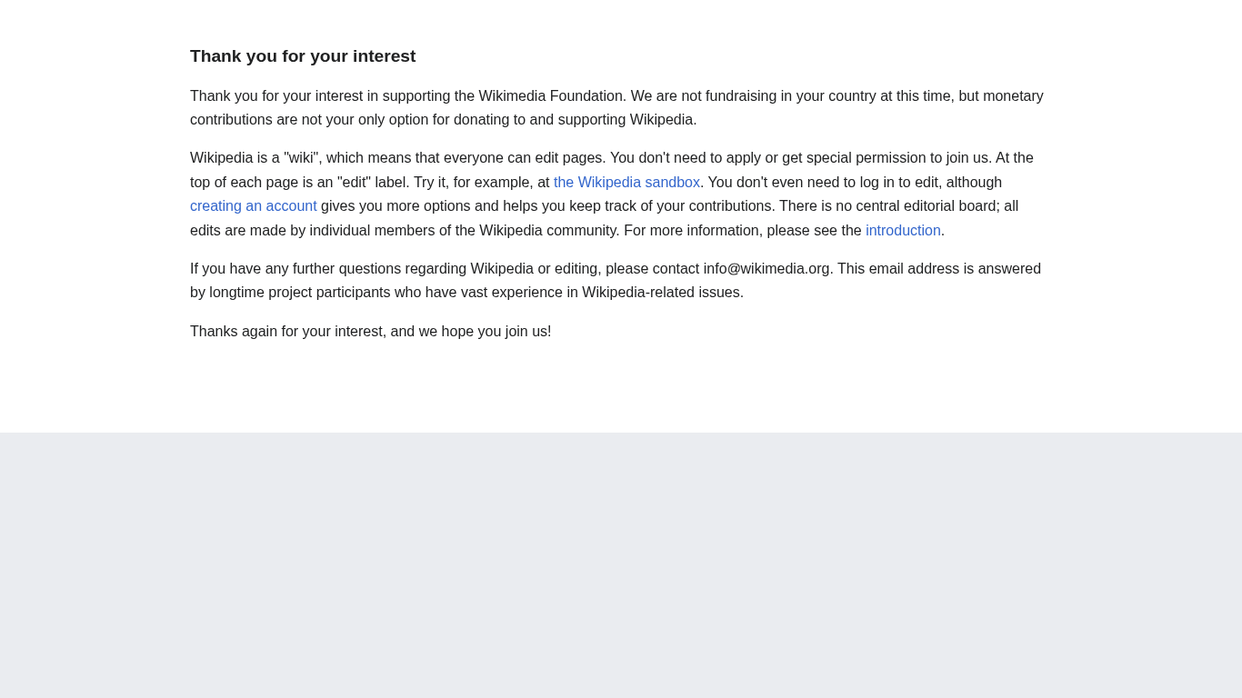 | AI-анализ | The website is the donation platform for the Wikimedia Foundation, a nonprofit organization that hosts Wikipedia and other free knowledge projects. The site invites visitors to make a donation to help expand the reach of these projects and ensure knowledge remains freely available for future generations. The text emphasizes the importance of contributions from readers, and the site includes a link to information about editing Wikipedia for those who are interested but unable to donate monetarily. The site is available only in English and does not provide an option for language selection. |