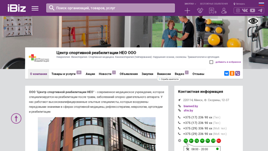 | AI-анализ | The website is a sports rehabilitation center named НЕО ООО, located in Minsk, Belarus, at Ф. Скорины, 12-37. The center specializes in neurorehabilitation, physiotherapy, sports medicine, kinesiotherapy (taping), posture issues, and scoliosis. It also offers traumatology and orthopedic services. The company's contact information and address are provided. The website contains sections for company information, products and services, news, announcements, vacancies, videos, and customer reviews. The center provides manual therapy, sports rehabilitation, massage, physiotherapy, and specialized traumatology and orthopedic services. They use advanced technological equipment to help clients effectively address various health issues, such as myofascial pain syndrome, back pain, radiiculitis, and neurological manifestations |
