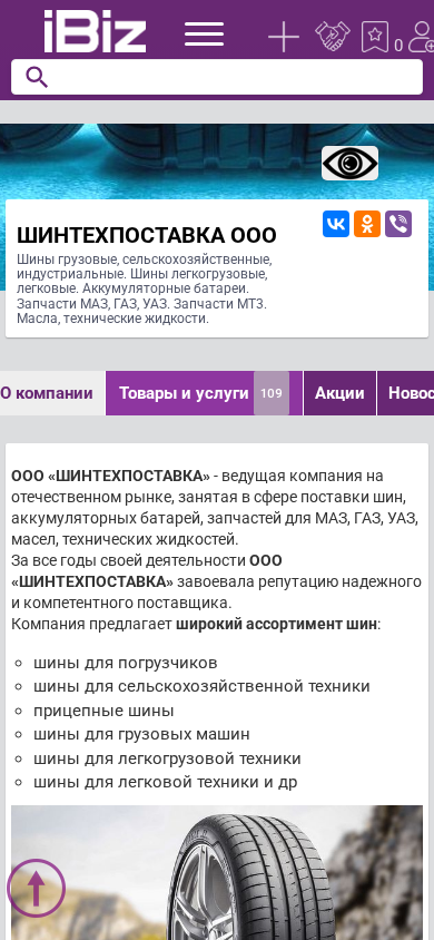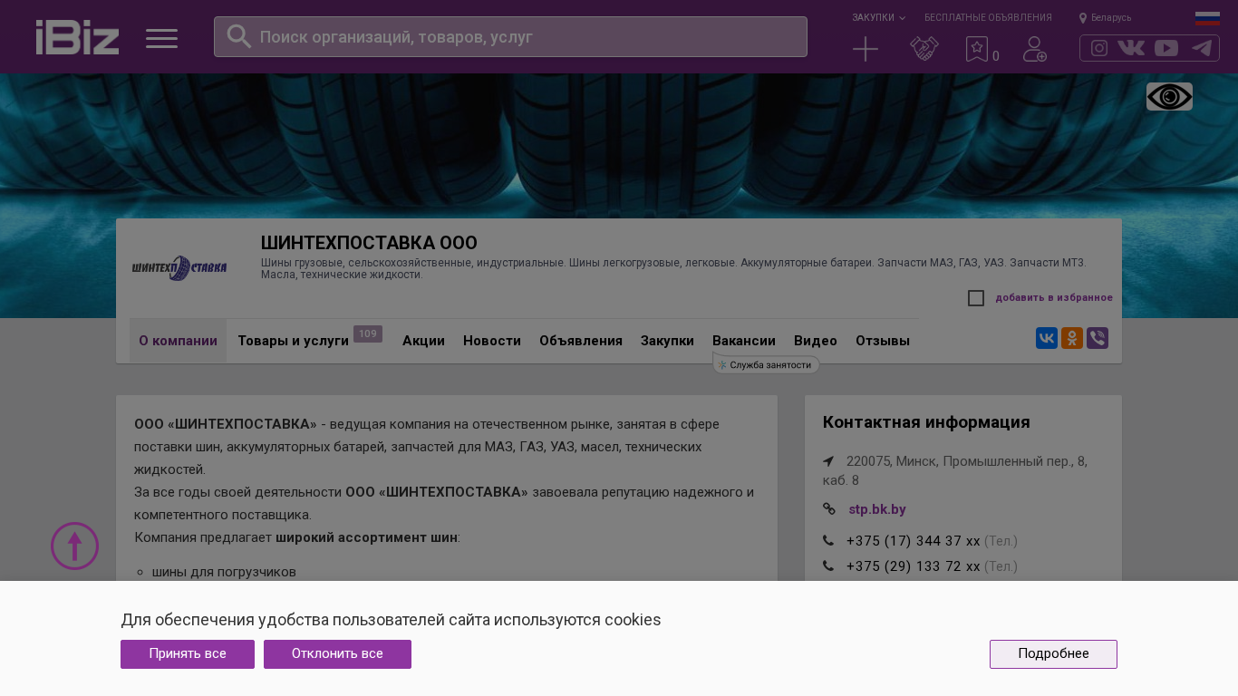 | Название / Заголовок | ШИНТЕХПОСТАВКА ООО - Шины грузовые, сельскохозяйственные, индустриальные. Шины легкогрузовые, легковые. Аккумуляторные батареи. Запчасти МАЗ, ГАЗ, УАЗ. Запчасти МТ3. Масла, технические жидкости.. 220075, Минск, , Промышленный пер., 8, каб. 8 |