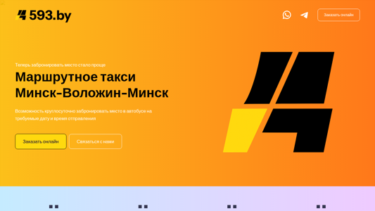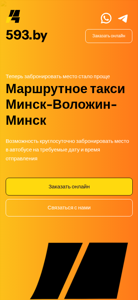 language: Belarusian This online resource, 593.by, is a platform for reserving a spot on a bus for Minsk-Volozin-Minsk route. Users can now make reservations easier online. The website offers the opportunity to book a seat on desired dates and times for marshrutka (minibus) services between Minsk and Volozin. The platform features affordable prices, comfortable buses, and experienced drivers. Online booking is available, and users can contact the service through WhatsApp or Telegram. The website includes information on available departures, dates, and times with corresponding prices and seat availability. The company behind the platform is OOO «Хутка-Драйв», which operates on BusPro and can be found on WhatsApp and Telegram.