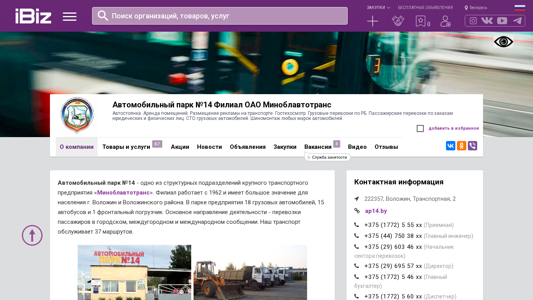 | AI-анализ | The portal is an automobile park and branch office of OAO Minoblavtotrans, offering an auto parking lot, rental of premises, advertising placement on vehicles, vehicle inspections, cargo transportation within Belarus, and passenger transportation on demand for both legal and physical entities. The park features 18 cargo trucks, 15 buses, and one front-loading crane. The primary focus is on passenger transport services in local, regional, and international travel, operating 37 routes. Additional services include passenger transportation on demand, vehicle inspections, rental of premises, cargo transportation within Belarus, heavy vehicle maintenance, tire service for all vehicle brands, and an auto parking lot. |