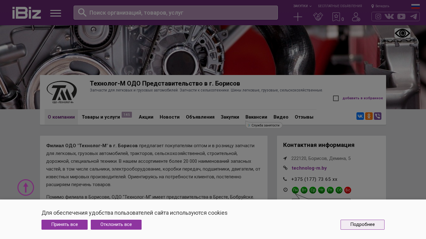 AI-анализ | The portal Technolog-M ODO Representative Office in Borisov is a retailer of spare parts for light and heavy automobiles, as well as spare parts for agricultural and construction machinery. It offers light, heavy, and agricultural tires. The company is located in Borisov at Demina 5, and its contact information and map are provided on the website. Their product range includes over 20,000 items, such as engine parts, electrical components, transmission boxes, bearings, engines, and filters from well-known international manufacturers. The company aims to expand its offerings based on customer demand and has representative offices in Brest and Bobruisk as well. The Borisov branch currently sells spare parts for passenger cars, spare parts for heavy trucks, spare parts for tractors, spare parts for municipal equipment, and agricultural machinery. They also offer automotive chemicals, tires, bearings, and |