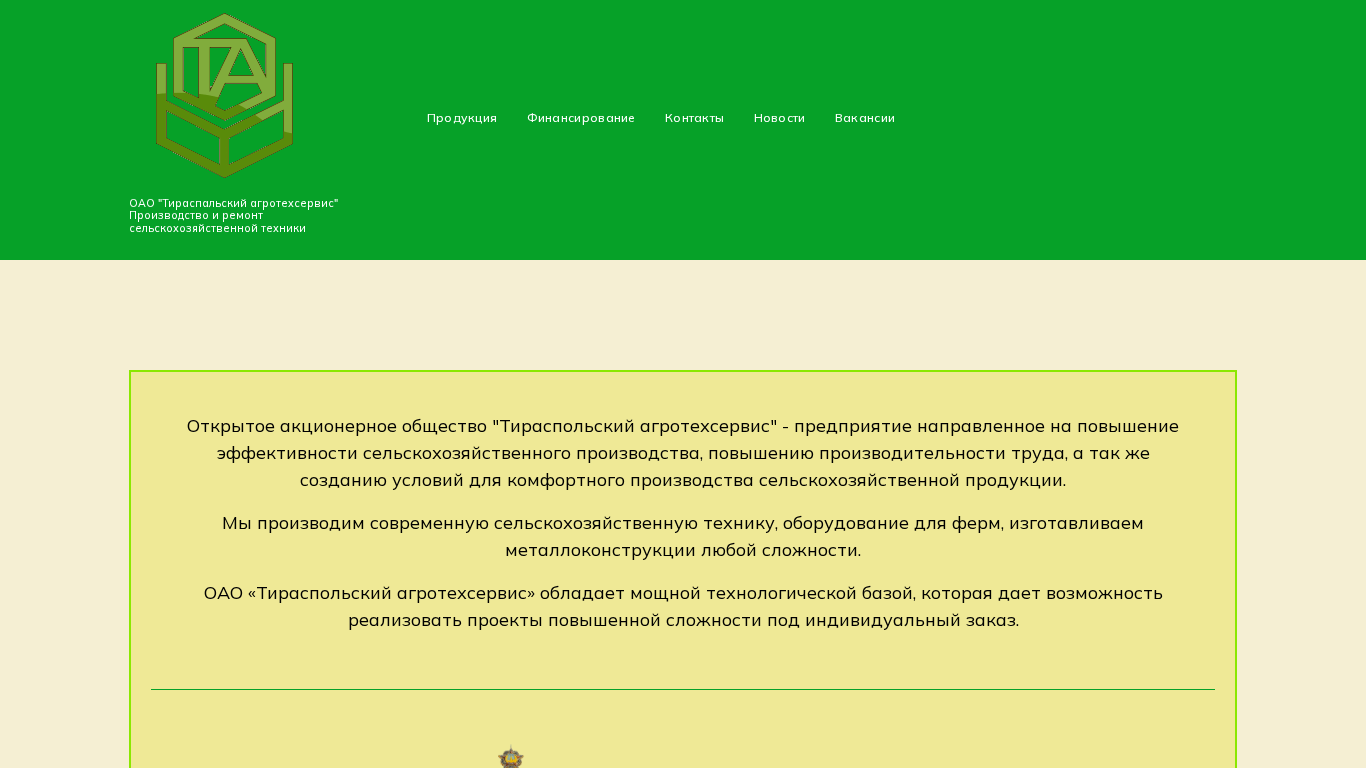 | Название / Заголовок | ОАО "Тираспальский агротехсервис" — ОАО "Тираспальский агротехсервис" Производство и ремонт сельскохозяйственной техники |