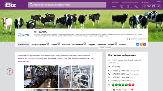 | Название / Заголовок | М-ТЕХ ООО - Оптовые поставки оборудования и комплектующих для с/х. Импортное молочно-доильное оборудование марки Impulsa/Itec, насосы и мешалки для вязких жидкостей марок FF-Maschinenbau, LJM, Johstadt. Запчасти и комплектующие к доильному оборудованию.. 223053, Минск, , Логойский тракт, 50, офис 347, БЦ |