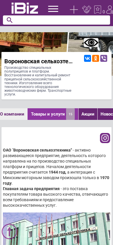 | AI-анализ | The portal "Voroновская сельхозтехника OAO" specializes in the production of specialized semi-trailers and platforms. They also provide restoration and major repairs for tractor-mounted agricultural equipment, and manufacture all technological equipment for livestock farms. Additionally, they offer transport services. The company was established in 1944 and integrated with the Minsk Motor Plant in 1970. Their primary focus is on delivering high-quality products to customers and providing excellent services. Their offerings include a self-unloading tractor semi-trailer (PТ-14С), a platform with a manipulator (ПМК-10), a specialized agricultural semi-trailer with a set of interchangeable adapters (ПСС-15), a specialized agricultural semi-trailer (ПСС-20), a |