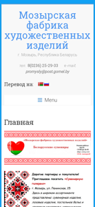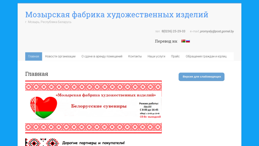 | AI-анализ | url: https://promysly.by/ The web project "Мозырская фабрика художественных изделий" (Mozirska fabrika hudzhetskich izdelij, Mozir Factory of Artistic Products) is a Belarusian business based in the city of Mozir, Republic of Belarus. The website provides information about the factory's history, its current offerings, and services, as well as contact details and electronic forms for inquiries from both individuals and organizations. The site also features sections for news, organizational history, information on renting out facilities, and pricing for various offerings. The site is available in both Belarusian and Russian languages. The main menu includes sections for the homepage, news, organizational history, information on renting out facilities, services, and pricing, as well as links to the sites of the |