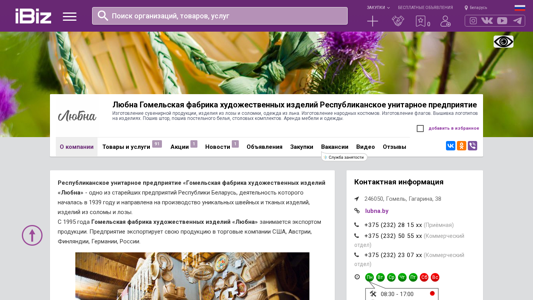 | AI-анализ | This online resource is a Belarusian Republic enterprise named "Lubna Homielskaya Fabrika Khudozhestvennyh Izdeiliy" or "Lubna Homiel Artistic Goods Factory". The website provides information about the production and services of this enterprise, which includes the manufacturing of souvenir products, items made from willow and rye straw, and linen clothing. They also create traditional costumes and flags, as well as embroidering logotypes on items. The factory offers sewing services for curtains, bedding, and tableware sets, and rents out furniture and clothing. The enterprise is located in Homiel, Belarus, at 38 Gagarina Street. The website does not provide contact information or a map for directions. Keywords associated with this website include "изделия" (items), "вышивка" (em |