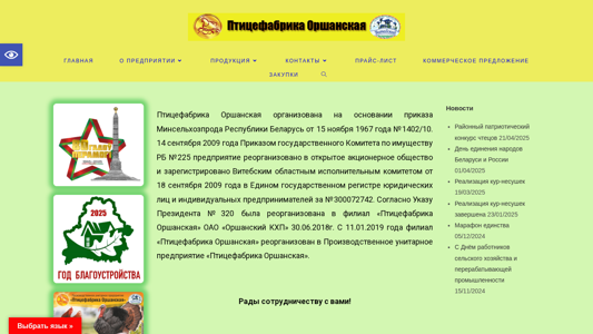 | Название / Заголовок | Главная - Производственное унитарное предприятие "Птицефабрика Оршанская" |