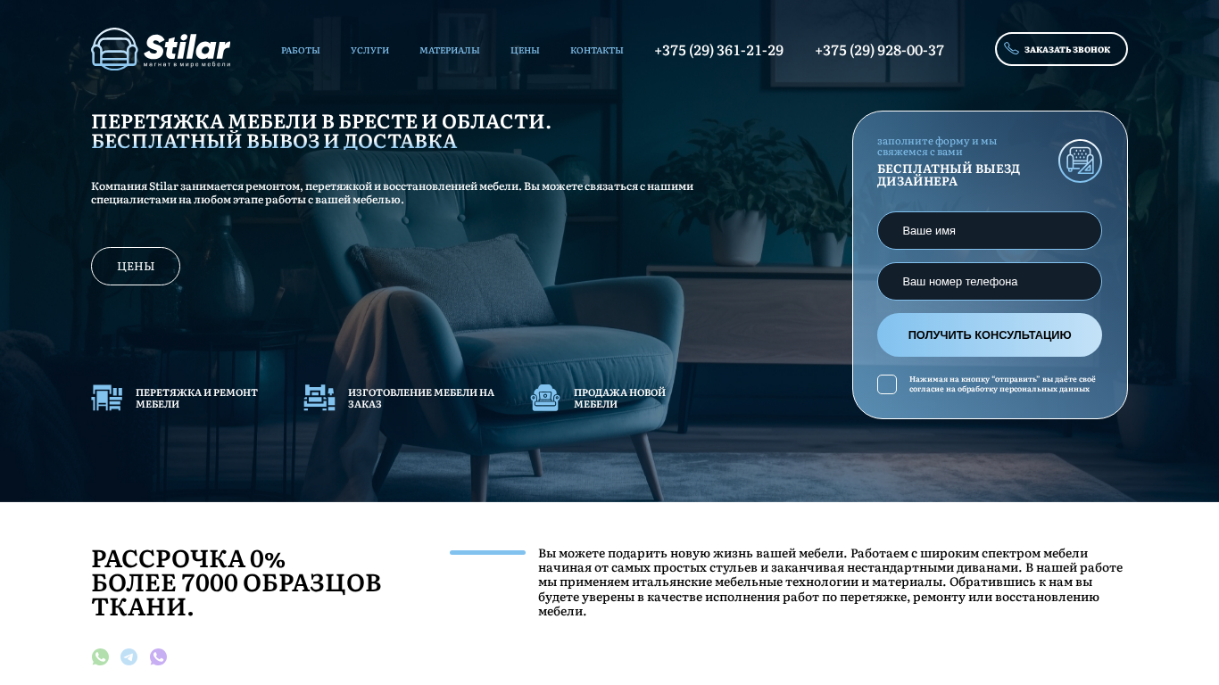 | AI-анализ | This online resource is dedicated to furniture upholstery services in Brest and the surrounding area. The company, named Stilar, offers reupholstering, repair, and restoration of various types of furniture including sofas, chairs, and cushions. The website provides a phone number for contact and mentions a 0% financing option. Customers can request a consultation and receive a free visit from a designer. The company boasts a wide selection of over 7000 fabric samples and uses Italian technology and materials in their work. Examples of completed projects are shown on the site. Prices for various furniture pieces are given, such as 40 rub for chair upholstery, 250 rub for sofa upholstery, 200 rub for kitchen sofa upholstery, and 70 rub for chair cushion upholstery. Additionally, customers receive four free chairs with |