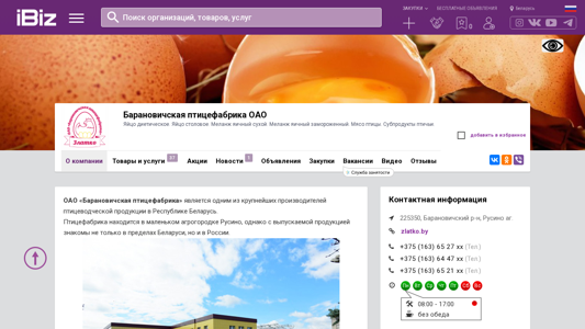 | Название / Заголовок | Барановичская птицефабрика ОАО - Яйцо диетическое. Яйцо столовое. Меланж яичный сухой. Меланж яичный замороженный. Мясо птицы. Субпродукты птичьи. . 225350, , Русино аг. |