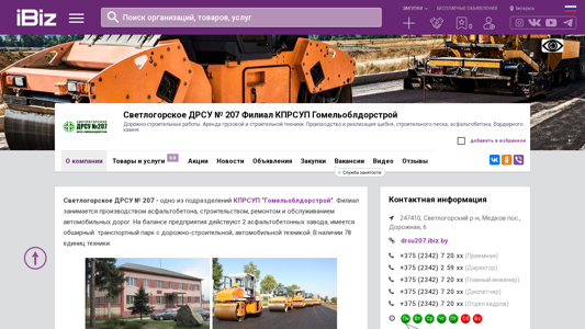 | Название / Заголовок | Светлогорское ДРСУ № 207 Филиал КПРСУП Гомельоблдорстрой - Дорожно-строительные работы. Аренда грузовой и строительной техники. Производство и реализация щебня, строительного песка, асфальтобетона, бордюрного камня.. 247410, , Медков пос., Дорожная, 6 |