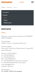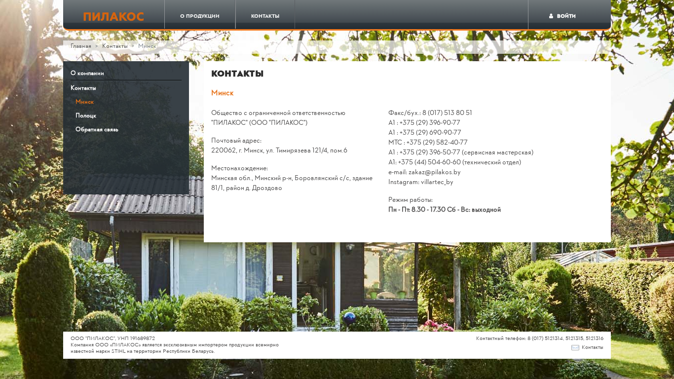 | AI-анализ | The website is for the Belarusian company "ПИЛАКОС" (OOO "ПИЛАКОS"), an exclusive importer of the worldwide known STIHL brand products in Belarus. The website includes information about the company, contacts, and the location. The title is "Минск" and the keywords include "минск", "контакты", "375", "пилакос", "ооо", "продукции", "017", "войти", "главная", "компании", "полоцк", "обратная", "связь", "общество", "ограниченной", "ответственностью", "почтовый", "адрес", "220062", "тимирязева", and "1 |