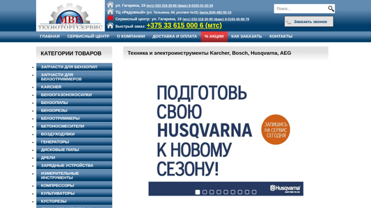 | AI-анализ | This website is an online store specializing in the sale of Karcher, Bosch, Husqvarna, and AEG equipment and electronics. The store is located at ul. Gaagarin, 19 (mts) and has phone numbers 033-318-30-80 and 8-0163-41-02-29 for contact and inquiry purposes. The store also has a service center at the same location with phone number 033-318-30-90 and fax number 8-0163-45-86-79. For quick orders, customers can call +375 33 615 000 6. The store sells a range of products including vacuum cleaners, power tools, lawn mowers, concrete mixers |