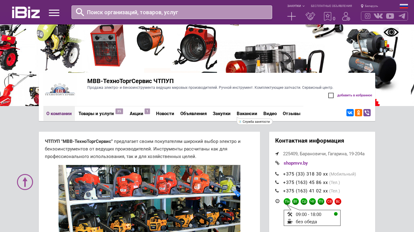 | Название / Заголовок | МВВ-ТехноТоргСервис ЧТПУП - Продажа электро- и бензоинструмента ведущих мировых производителей. Ручной инструмент. Комплектующие запчасти. Сервисный центр.. 225409, Барановичи, , Гагарина, 19-204а |