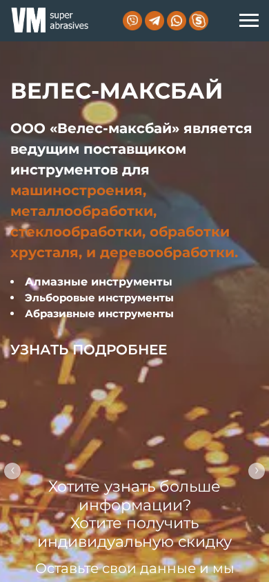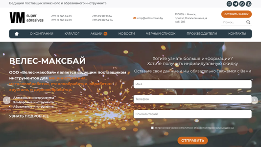 | AI-анализ | The portal Veles-Maksbai offers a wide range of abrasive, diamond, and elborative tools for machinery manufacturing, metalworking, glass processing, crystal processing, and woodworking in Minsk and Homel, Belarus. The company is the official supplier of abrasive and diamond tools in Belarus and delivers throughout the country. The website provides detailed information about the company, delivery and payment conditions, articles, catalogs, and news. The main product categories include diamond instruments, elborative tools, and abrasive tools. The company also offers CBN grinding wheels for sharpening belt grinders, elborative grinding wheels on ceramic bond and organic bond, and various other tools. Visitors can submit a request for more information and individual discounts by providing their contact details. The company complies with the data protection policy. Veles-Maksbai is an |