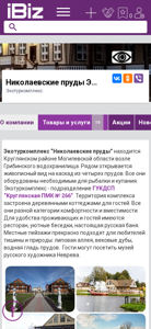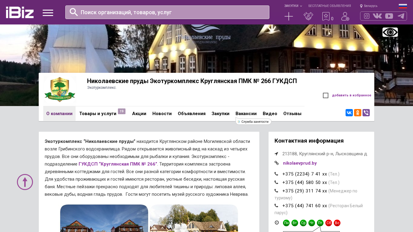 The portal 'Nikolaevprud.ibiz.by' is a Belarusian ecotourism complex website centered around 'Nikolaevskiy Prudy' or 'Nikolaev Lakes' located in Kruglyansky District, Mogilev Oblast. The website provides details on the complex, including its location near Gribinsky Water Reservoir and the scenic view of a cascade of four ponds. The complex offers various accommodations in wooden cottages, each with different comfort levels and capacities. Facilities include a restaurant, cozy gazebos, a traditional Russian banya, and a museum of Russian painter Nevrev. Activities offered include renting a gazebo for barbecue or bonfire, using the Russian banya, billiards, archery, paintball, go-karting, museum visits