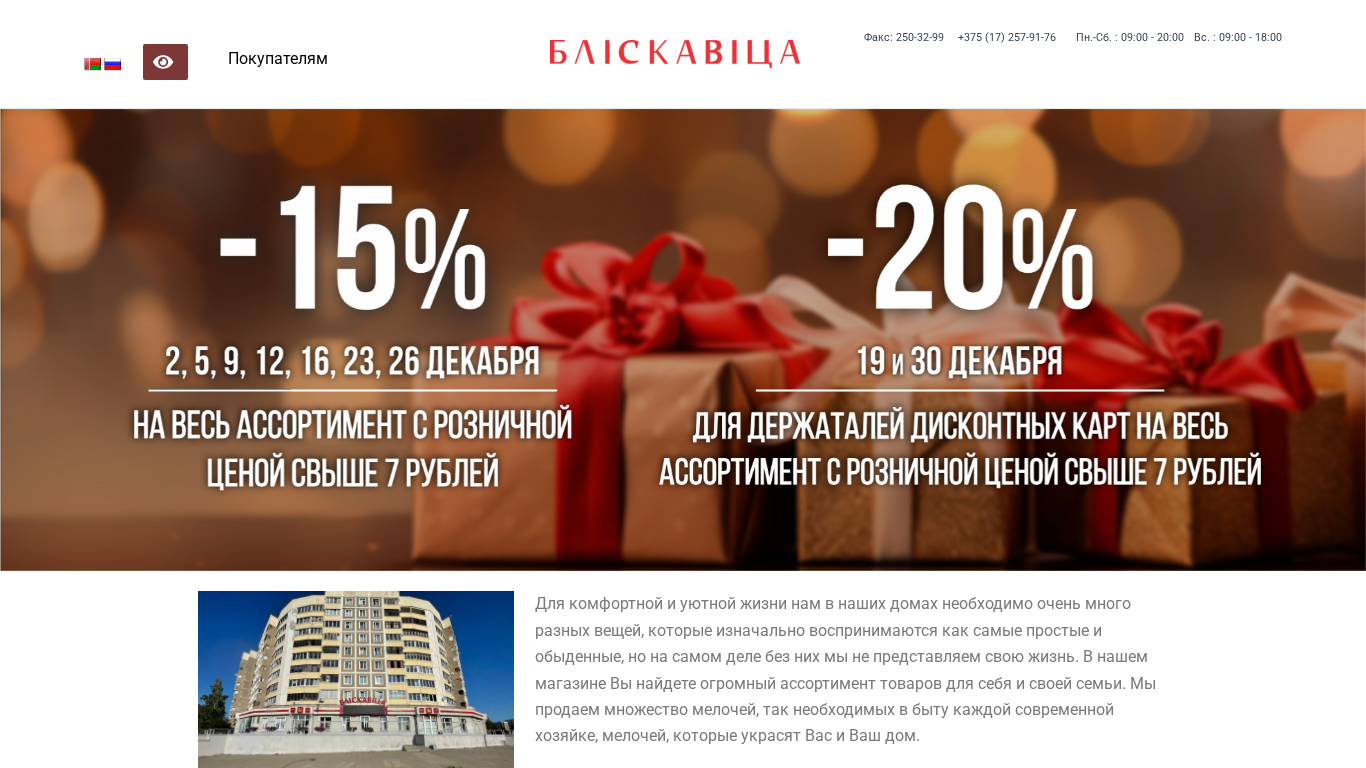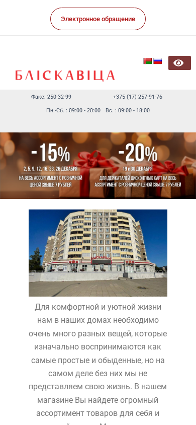 | AI-анализ | The web project "Блискавица" is an e-commerce website selling various household items. The website provides electronic application submission and contact information with phone numbers (+375 17 257-91-76, 250-32-99) for customer service. The site is available in Belarusian language and operates from Monday to Saturday between 9:00 AM and 8:00 PM, and on Sundays from 9:00 AM to 6:00 PM. The website features an electronic application section and a selection of gift certificates available in denominations of 20, 30, 50, and 100 Belarusian rubles. All rights reserved © 2025 Блискавица. |