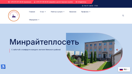 | AI-анализ | The web project "Минрайтеплосеть" (Minsk District Heating Network) is a state-owned enterprise specializing in heating and water supply systems, boilers, central thermal power plants, and related services. The company's primary focus is on providing reliable and uninterrupted operation of equipment, installations, structures, and transmission devices in the Minsk district. Additionally, it offers comprehensive services for waste management, helping citizens and businesses maintain clean living and working conditions. The website provides information on various topics such as administration, procedures, anti-corruption efforts, news, local partners, contacts, jobs, and services. Services include water and heat supply for both individuals and corporations, tariffs, social standards, waste disposal, and recycling. The site also offers rental equipment, construction services, and various other utilities. Contact information includes phone numbers for the reception desk and emergency dispatch, as well as |