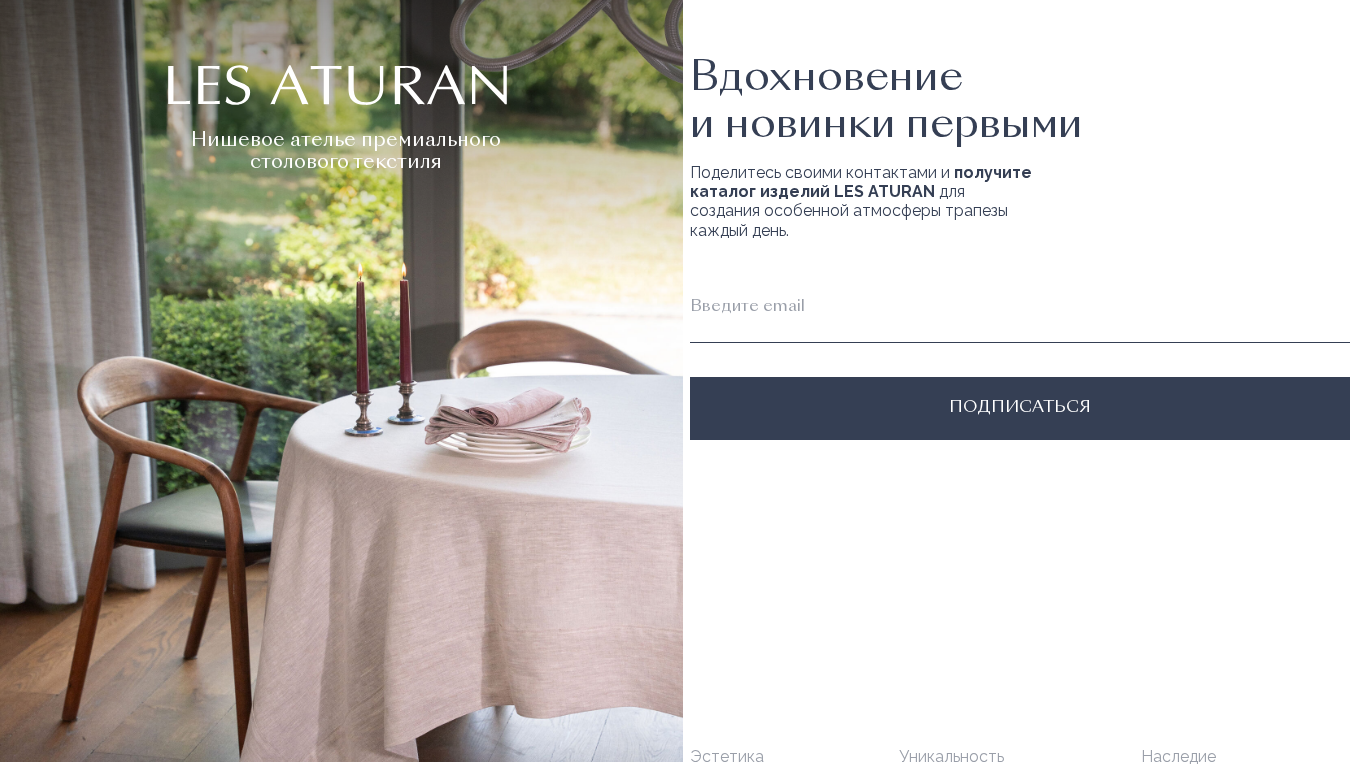 | AI-анализ | --- This website, titled "LES ATURAN," is a premium table linen atelier. The description specifies that it is a niche studio. Keywords associated with this website include "les," "aturan," "обязательное поле" (obligatory field), "поле укажите, пожалуйста" (please indicate the field), "корректный email" (correct email), and "подписаться" (subscribe). The website prompts users to enter a correct email address twice in order to subscribe. The text also mentions "вдохновение и новинки первыми" (inspiration and novelties first), suggesting that the website offers the latest trends. The website's language is in Cyrillic and appears to be based on the Tilda platform. The main focus of the website is to create a |