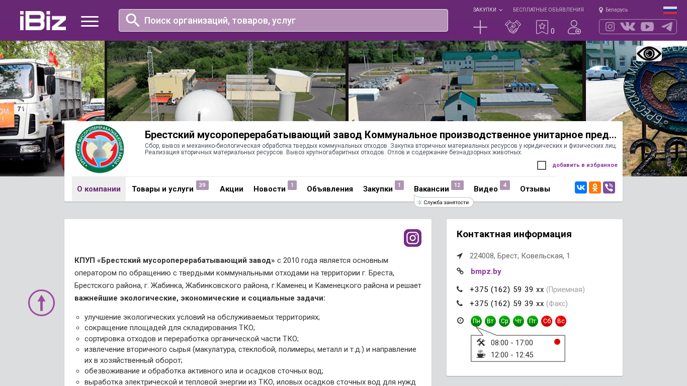 | Название / Заголовок | Брестский мусороперерабатывающий завод Коммунальное производственное унитарное предприятие - Сбор, вывоз и механико-биологическая обработка твердых коммунальных отходов. Закупка вторичных материальных ресурсов у юридических и физических лиц. Реализация вторичных материальных ресурсов. Вывоз крупногабаритных отходов. Отлов и содержание безнадзорных животных.. 224008, Брест, , Ковельская, 1 |