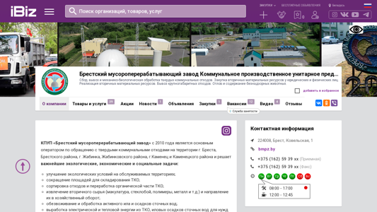 | AI-анализ | This website is dedicated to the Brest Municipal Waste Processing Enterprise, a unitary production enterprise that deals with the collection, disposal, and mechanico-biological treatment of solid municipal waste. The company also purchases secondary materials from both legal entities and individuals, and sells them. It provides services for the removal of large-sized waste and animal capture and care. The website includes sections for company information, products and services, announcements, vacancies, and customer reviews. It is based in Brest, Belarus, at the address Ковельская, 1. |