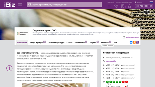 | AI-анализ | The website is a Belarusian company, Gidromashservis OOO, that specializes in the production and sale of gofrocardona (gofrokarbon in English, a type of corrugated cardboard). The company uses maculatura (secondary raw materials) from other businesses and collection points for the production process, contributing to resource conservation and minimizing environmental impact. The company's offerings include three-layer and five-layer gofrocardona, shoeboxes, pizza boxes, jars for confectionery items, jars for meat and poultry, jars for vegetables and fruits, and four-clamp boxes. The production capabilities are designed for an annual yield. |