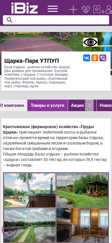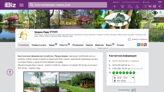 | Название / Заголовок | Щарка-Парк УТПУП - База отдыха - рыбное хозяйство Щарка. Два домика для проживания. Банный комплекс с прудом. Столовая, беседки. Любительский лов рыбы. спортивный лов рыбы. Форель, карась, подлещик, карп, стерлядь, щука.. 222431, , Щарка д. |