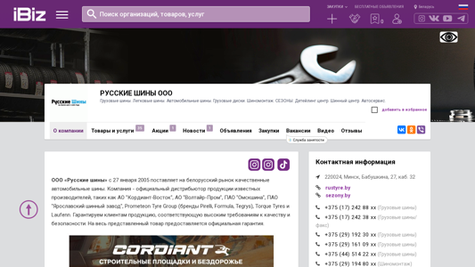 | Название / Заголовок | РУССКИЕ ШИНЫ ООО - Грузовые шины. Легковые шины. Автомобильные шины. Грузовые диски. Шиномонтаж. СЕЗОНЫ: Детейлинг центр. Шинный центр. Автосервис.. 220024, Минск, , Бабушкина, 27, каб. 32 |