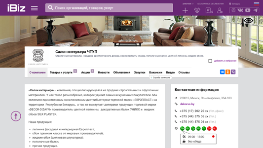 | AI-анализ | The website is a retail store specializing in the sale of building and decorative materials. The company, "Салон интерьера ЧТУП," is the exclusive distributor of the European Plast brand in Belarus and also acts as a dealer for Decor-Dizayn's colored plaster, Uniks decorative blocks, and Silk Plaster liquid wallpaper. The product range includes Europlast facade and interior plaster, premium-class wallpaper from world manufacturers, liquid wallpaper, and other items. The company offers individual customer service, with sales staff helping clients find suitable solutions for their interiors. The website provides a map for visitors to find the store's location in Minsk, Belarus. |