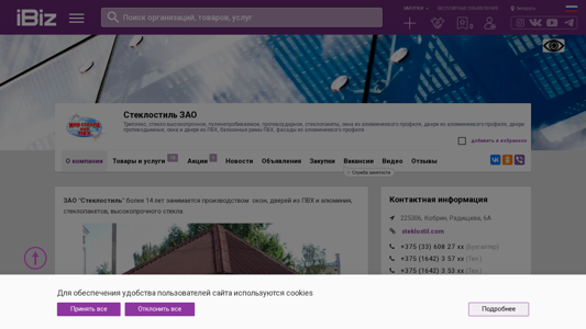 | AI-анализ | The web project "Стеклостиль ZAO - Тriplex" is a Belarusian company based in Кобрин, specializing in the production and sale of high-strength, bulletproof, and impact-resistant glass, glass packs, windows, and doors made from aluminum and PVC profiles. The company offers a wide range of services including non-standard window production, installation/removal, wall finishing, measurement, lamination, and delivery. Their product catalog includes PVC and aluminum windows and doors, high-strength glass, bulletproof glass, industrial garage doors, vitrages, partition walls, balcony railings, and shades. All products are manufactured using modern equipment and follow industry standards. The company also offers discounts and special deals for partners. The contact information and directions to the company location are provided. |