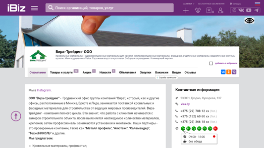 AI-анализ | This online resource is dedicated to the sales of roofing and facade materials from leading global manufacturers. The company, named Вира-Трейдинг ООО, offers a full range of services, from measuring building sites to the installation and mounting of materials. The product catalog includes roofing materials, PVC windows, fencing and ornamental gates, Velux mansard windows, roof drainage systems, insulation materials, and clinker bricks. The company partners with reputable brands such as "Металл профиль," "Алютекс," "Саламандер," and "ТехноНИКОЛЬ." The website is located at vira.ibiz.by. |