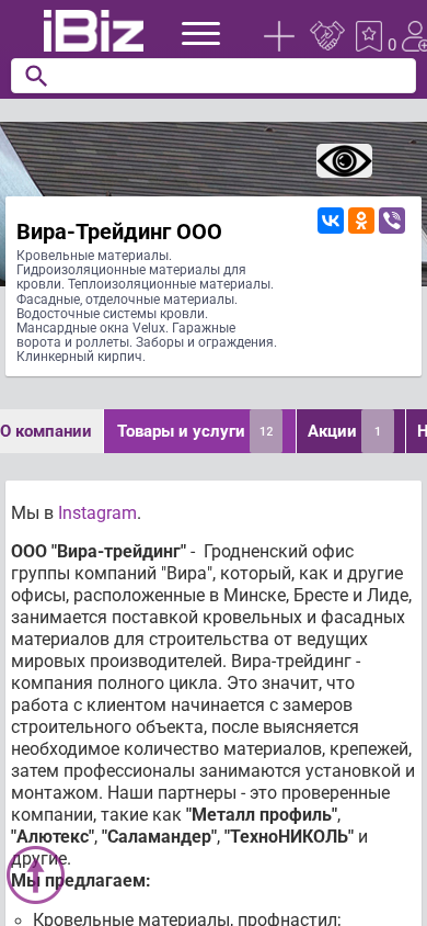 Название / Заголовок | Вира-Трейдинг ООО - Кровельные материалы. Гидроизоляционные материалы для кровли. Теплоизоляционные материалы. Фасадные, отделочные материалы. Водосточные системы кровли. Мансардные окна Velux. Гаражные ворота и роллеты. Заборы и ограждения. Клинкерный кирпич.. 230001, Гродно, Суворова, 137 |