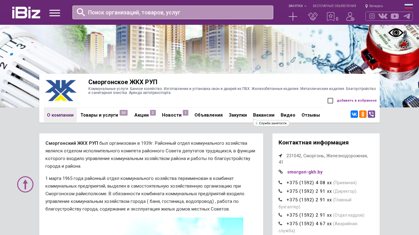 | Название / Заголовок | Сморгонское ЖКХ РУП - Коммунальные услуги. Банное хозяйство. Изготовление и установка окон и дверей из ПВХ. Железобетонные изделия. Металлические изделия. Благоустройство и санитарная очистка. Аренда автотранспорта. . 231042, Сморгонь, , Железнодорожная, 41 |