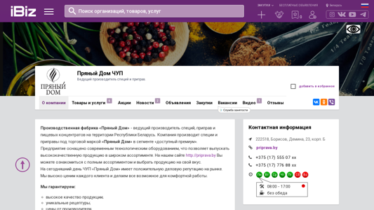 | AI-анализ | This website is for the Belarusian company "Пряный Дом ЧУП" (Pripyatny Dom CHUP), which is a leading producer of spices and seasonings in Belarus. The company's address is listed as 222518, Borisov, Demina 23, korp. B. The site provides information about the company, its products and services, including a full range of spices and seasonings under the brand name "Пряный Дом" (Pripyatny Dom), which targets the 'affordable premium' market segment. The production is made using modern technology, ensuring high-quality and a wide variety of offerings. Users can view the entire product assortment on the website and place orders. The company has a positive business reputation and values each customer, offering features such as competitive pricing, flexible discount systems, quick |