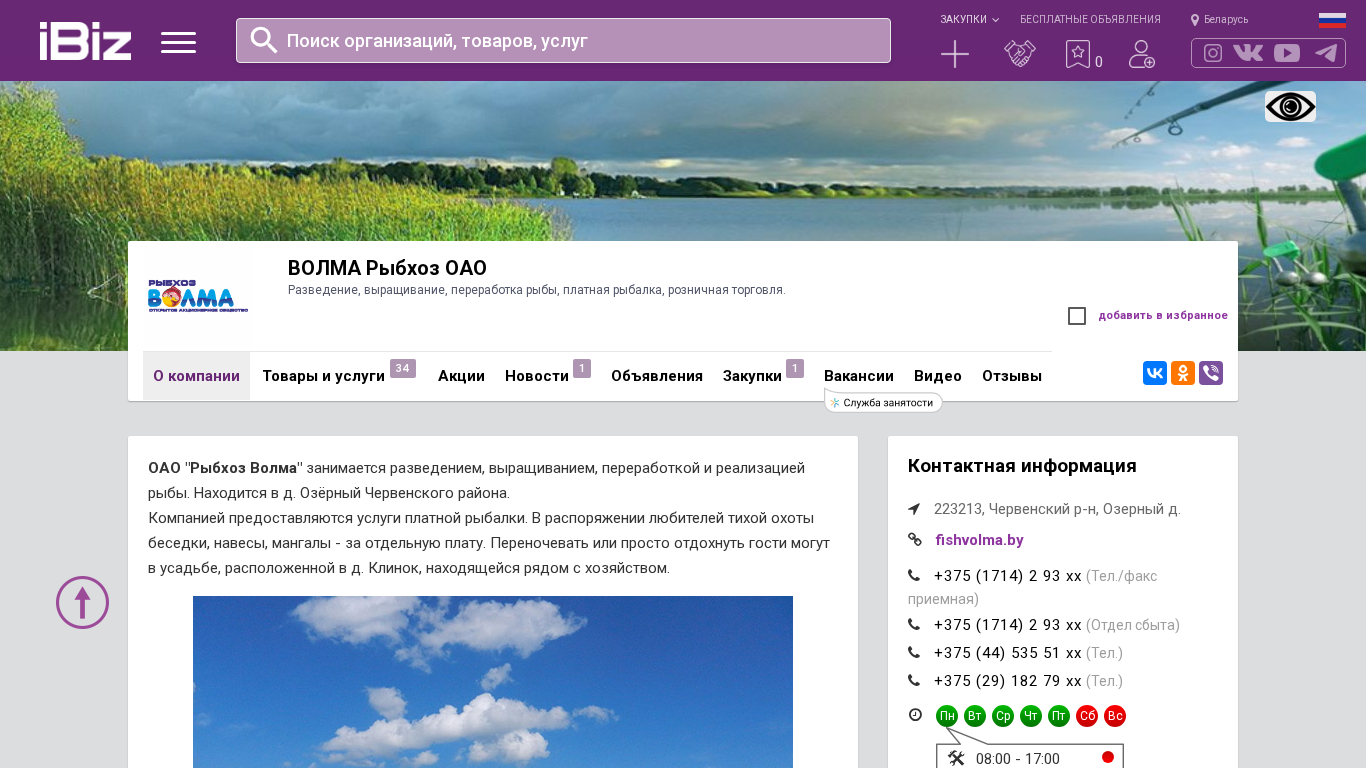 | Название / Заголовок | ВОЛМА Рыбхоз ОАО - Разведение, выращивание, переработка рыбы, платная рыбалка, розничная торговля.. 223213, , Озерный д. |