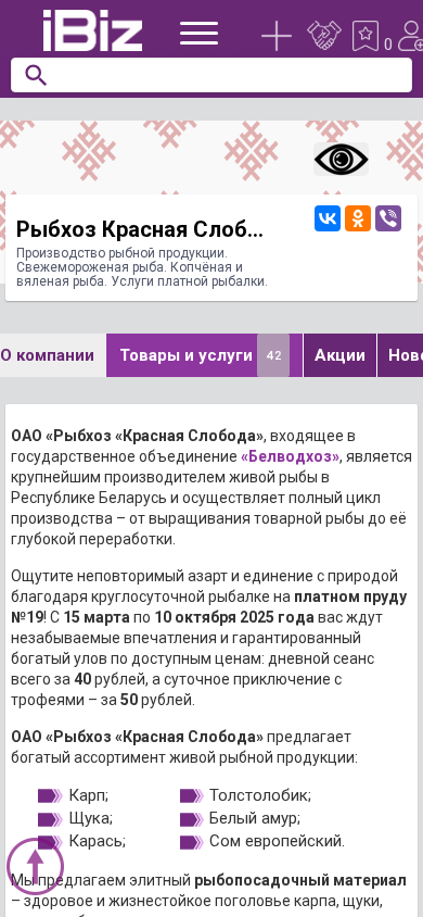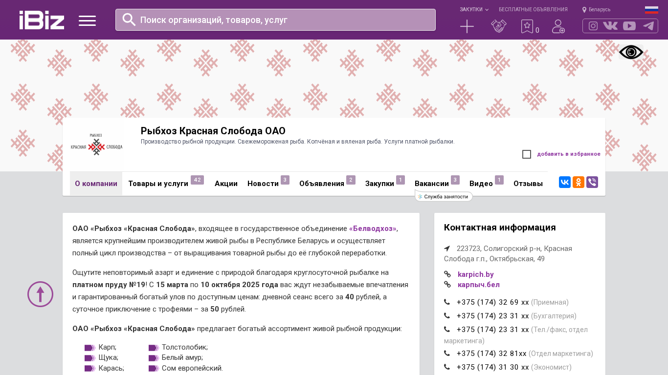 | Название / Заголовок | Рыбхоз Красная Слобода ОАО - Производство рыбной продукции. Свежемороженая рыба. Копчёная и вяленая рыба. Услуги платной рыбалки.. 223723, , Красная Слобода г.п., Октябрьская, 49 |