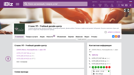 | AI-анализ | The website is a design center offering various design services and courses for children and adults. It provides design solutions for interiors, landscapes, furniture, advertising and graphic design, web design, drawing and painting, and clothing modeling. The center is located in the city of Minsk, Belarus, at the address Кальварийская, 1, офис 305. Contact information includes phone numbers +375 (17) 327 46 xx, +375 (29) 614 22 xx, and +375 (33) 614 22 xx. The company's UNP number is 101002050. The website is open for business from Monday to Friday, 09:00 - 21:30, without lunch breaks on weekdays. |