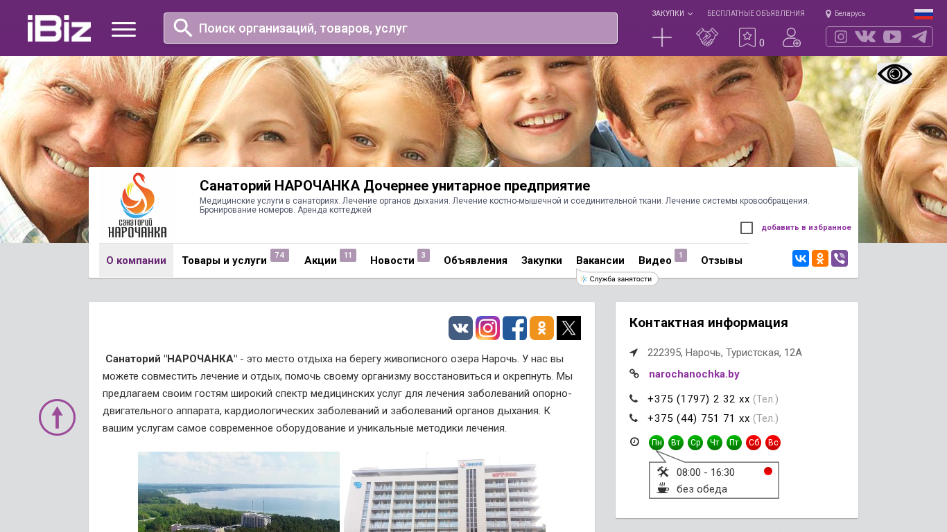 | Название / Заголовок | Санаторий НАРОЧАНКА Дочернее унитарное предприятие - Медицинские услуги в санаториях. Лечение органов дыхания. Лечение костно-мышечной и соединительной ткани. Лечение системы кровообращения. Бронирование номеров. Аренда коттеджей. 222395, Нарочь, , Туристская, 12А |