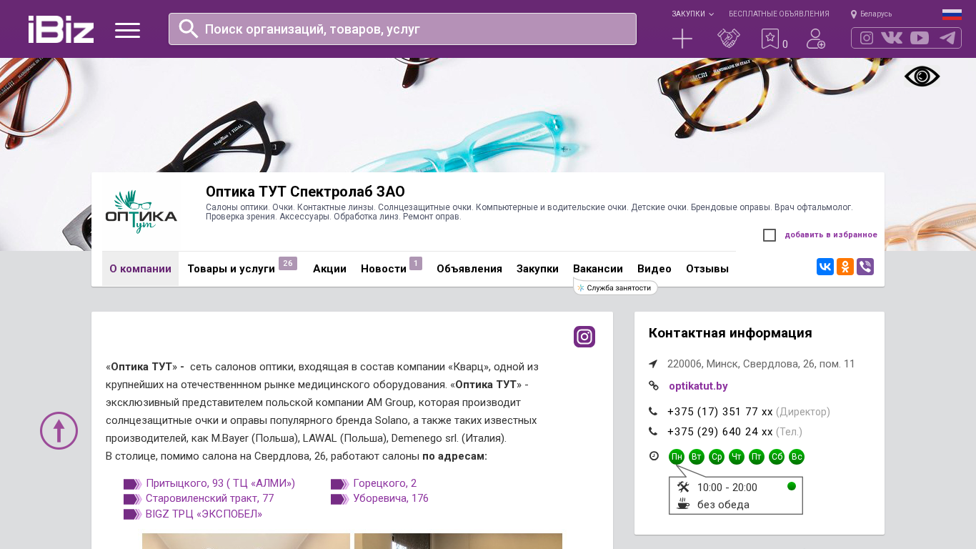 | SEO-описание | Оптика ТУТ Спектролаб ЗАО - Салоны оптики. Очки. Контактные линзы. Солнцезащитные очки. Компьютерные и водительские очки. Детские очки. Брендовые оправы. Врач офтальмолог. Проверка зрения. Аксессуары. Обработка линз. Ремонт оправ.. Схема проезда, контактные телефоны, адрес компании Оптика ТУТ Спектролаб ЗАО. 220006, Минск, , Свердлова, 26, пом. 11 |