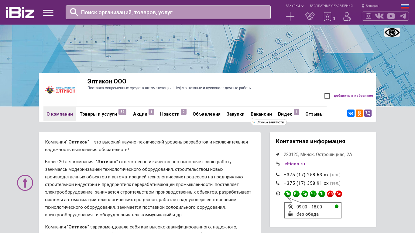 | Название / Заголовок | Элтикон ООО - Поставка современных средств автоматизации. Шефмонтажные и пусконаладочные работы.. 220125, Минск, , Острошицкая, 2А |