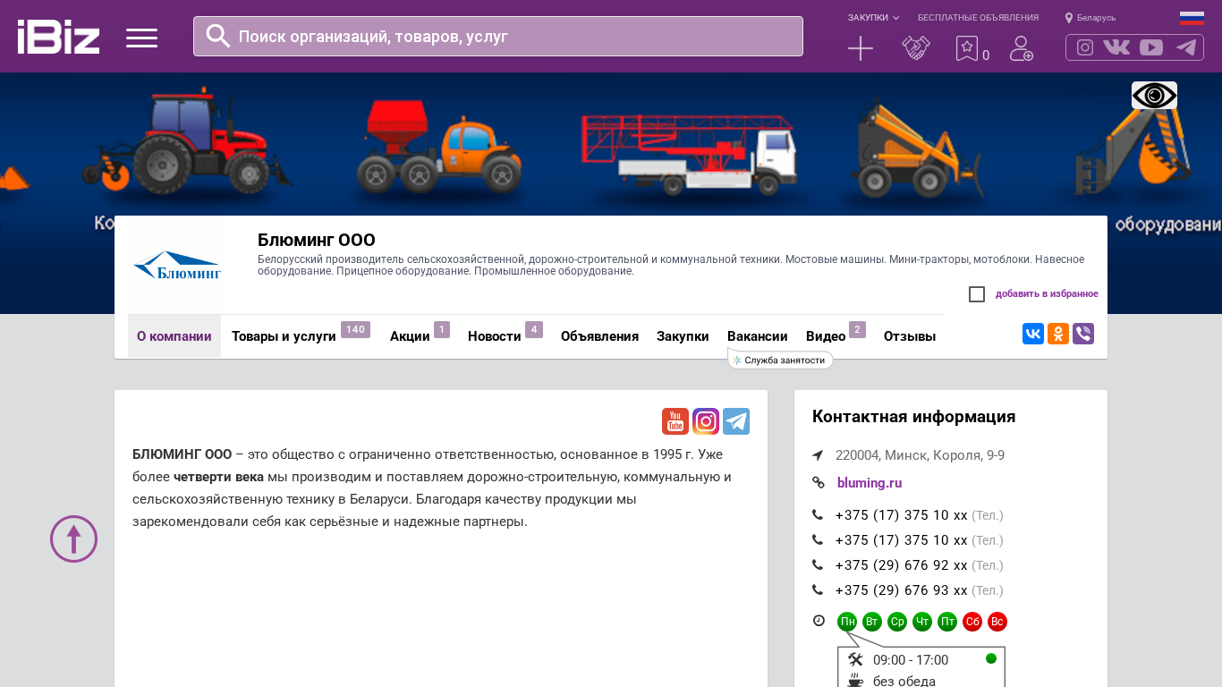 | SEO-описание | Блюминг ООО - Белорусский производитель сельскохозяйственной, дорожно-строительной и коммунальной техники. Мостовые машины. Мини-тракторы, мотоблоки. Навесное оборудование. Прицепное оборудование. Промышленное оборудование.. Схема проезда, контактные телефоны, адрес компании Блюминг ООО. 220004, Минск, , Короля, 9-9 |