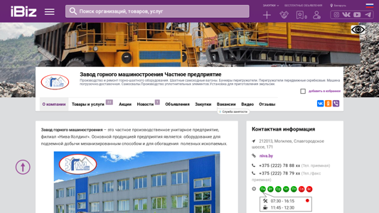 | AI-анализ | The portal is a private manufacturing enterprise, a branch of "Niva-Holding," specializing in the production and repair of mining and shaft equipment. The company offers mining vehicles such as self-propelled mining trucks, conveyor belt loaders, portable screw conveyor unloaders, and loading-unloading machines. Additionally, the company produces uplifting elements and an emulsion production unit. The enterprise is located in Mogilev, Belarus, at Slavogradskoe shosse 171. |