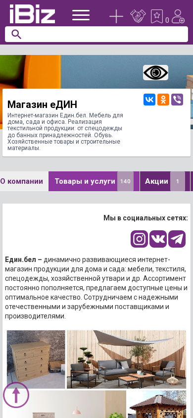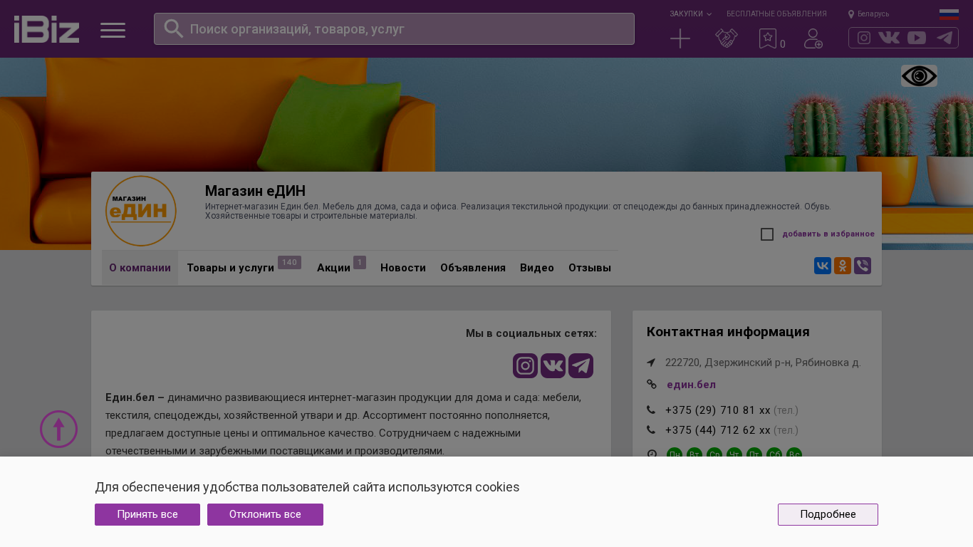 | Название / Заголовок | Магазин еДИН - Интернет-магазин Един.бел. Мебель для дома, сада и офиса. Реализация текстильной продукции: от спецодежды до банных принадлежностей. Обувь. Хозяйственные товары и строительные материалы. . 222720, , Рябиновка д. |