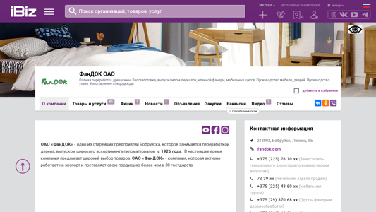 | AI-анализ | This website is for OAO FANDOK, a wood processing company located in Bobruisk, Belarus, at the address Ленина, 95. The company specializes in the full processing of wood, including forestry, the production and sale of various types of wood products such as pilings, pine boards, spruce boards, birch plywood, OSB, particle board, MDF, furniture panels, doors, and furniture. They also manufacture and sell wooden products like tables and chairs, as well as special clothing. The company was established in 1926 and exports its products to over 30 countries. The production process utilizes modern equipment and only eco-friendly materials. The raw materials for the products are primarily sourced from the company's own mills and sawmills. The product range includes sawn timber, boards, panel products, |